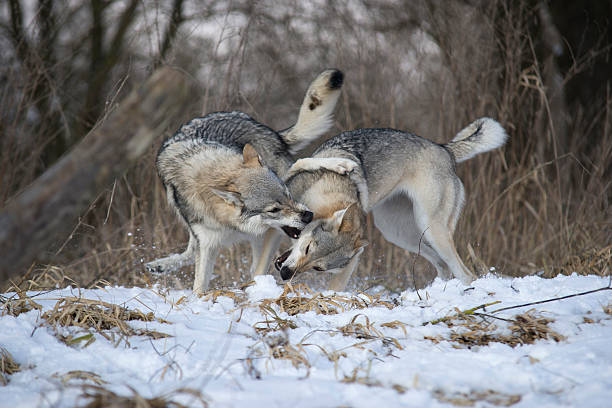 Playful Czechoslovakian Wolfdogs in snowy winter landscape.